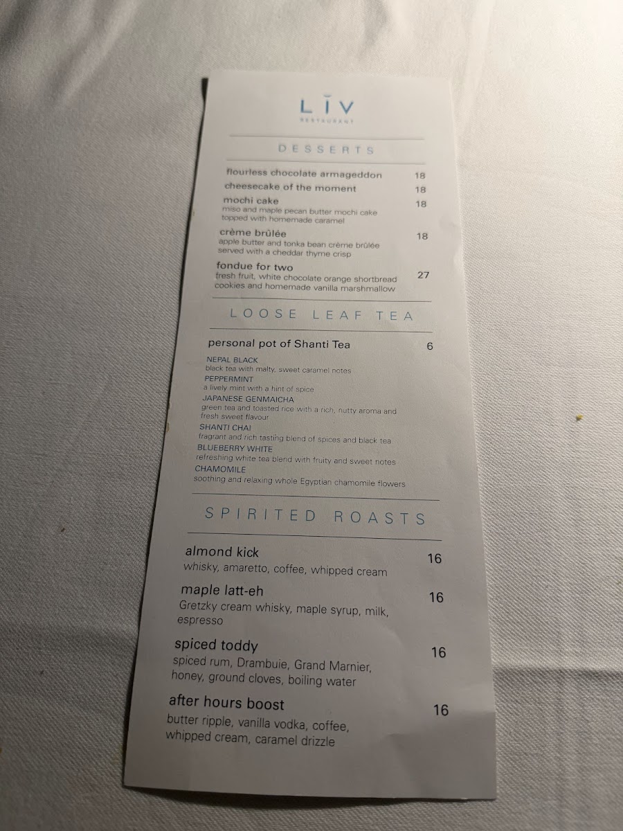 Overall, the menu at Liv Restaurant offers a thoughtfully curated selection that balances light and more substantial options, making it easy to tailor your meal to your appetite. The lighter fare, including Toast, Fresh Fruit Cocktail, Cereal with Milk, Cereal with Milk and Berries, and Granola with Milk, provides simple yet fresh choices ideal for a quick and refreshing start. For those seeking something more filling, the complete options such as Granola, Oats of Steel, Quinoa, Sliced Fruit Plate, and Bagel and Lox deliver a satisfying mix of wholesome ingredients and classic flavors. On weekends, the Weekend Brekkie Buffet stands out as a convenient and indulgent option, allowing guests to sample a variety of offerings in one sitting. Altogether, the menu reflects a clean, health-conscious approach with enough variety to appeal to both light eaters and those looking for a more complete breakfast experience.